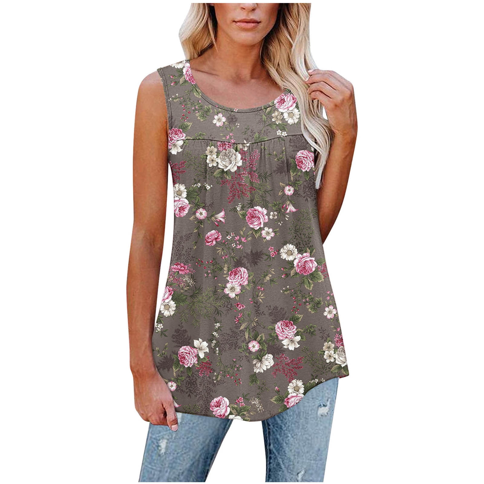 Fashion Women Casual Print Round Neck Sleeveless Printed Pleated Tank Tops Blouse Walmart Com